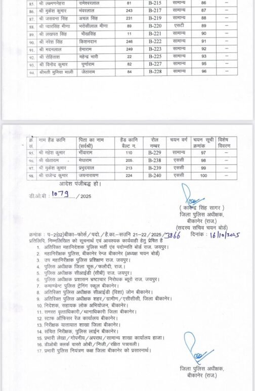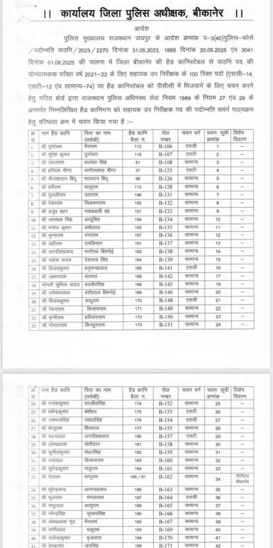 राजस्थान 1st न्यूज,बीकानेर। बीकानेर पुलिस महकमें में हैड कांस्टेबलों के एएसआई के आदेश जारी हुए है। इस सम्बंध में एसपी कावेन्द्र सागर के आदेश जारी किए है। जिसमें कुल 98 हैड कांस्टेबल को एएसआई बनाया गया है। जिन्हें अब अब संवर्ग पाठ्यक्रम हेतु पुलिस प्रशिक्षण केंद्र में भेजा जाएगा आदेशों के अनुसार कुल 98 एएसआई बने है। बीते दिनों इस सम्बंध में आदेश जारी किए गए थे। जिसमें 81 हैड कांस्टेबल को एएसआई बनाया गया था। जिसके बाद आज एक और सूची जारी की गयी है। जिसमें 17 और हैड कांस्टेबल को एएसआई बनाया गया है। ऐसे में कुल 98 हैड कांस्टेबल को एएसआई बनाया गया है।