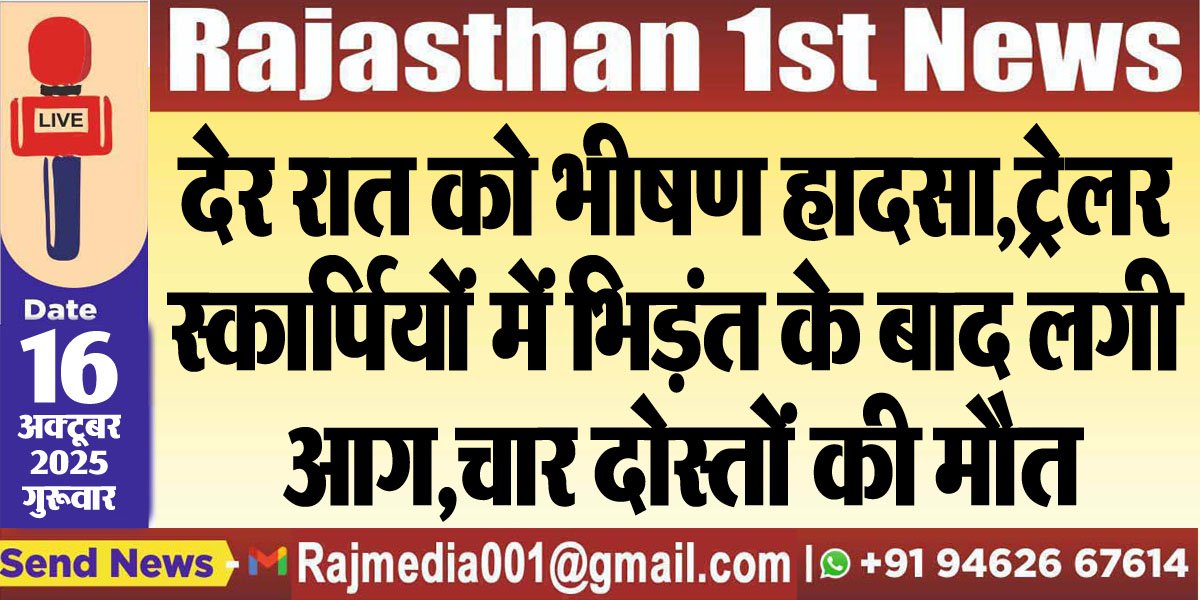 देर रात को भीषण हादसा,ट्रेलर-स्कार्पियों में भिड़ंत के बाद लगी आग,चार दोस्तों की मौत-Rajasthan News