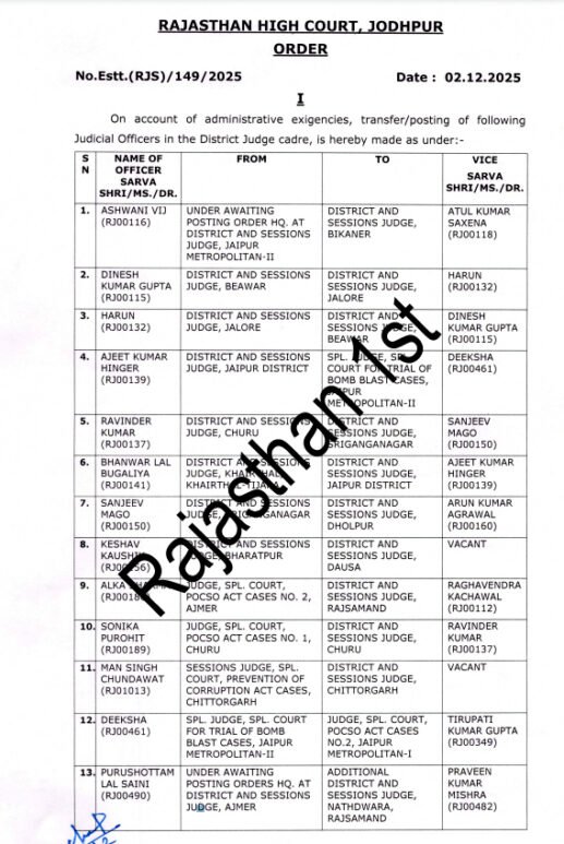 Bikaner News राजस्थान 1st न्यूज,बीकानेर। राजस्थान हाईकोर्ट ने 13 न्यायिक अधिकारियों के तबादलें किए है। जिनमें बीकानेर के जिला एवं सत्र न्यायाधीश का भी तबादला किया गया है। आदेशों के अनुसार बीकानेर जिला एवं सत्र न्यायाधीश के रूप में अब अनिल विज होंगे जो कि पूर्व में जयपुर में पदस्थापित थे।