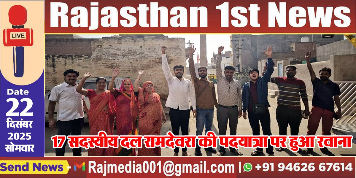Bikaner News राजस्थान 1st न्यूज,बीकानेर। मल मास में बाबा रामदेव जी महाराज के दर्शन हेतु रामदेवरा पैदल यात्रियों का 17 सदस्यीय दल सोमवार को गंगाशहर स्थित पाबु चोक बाबा रामदेव के धोक लगाकर रवाना हुआ। यात्रा प्रभारी जयकिशन सोनी ने बताया कि मल मास के पवित्र माह में बाबा के दर्शन हेतु दल रवाना हुआ है जो 29 दिसंबर को रामदेवरा में बाबा के दर्शन करेंगे। इस पैदल यात्रा में लकी गहलोत, पंकज पाणेचा, मुलचंद गहलोत, मोहित सोनी, निखिल सोनी, अंकित नाई, विकास कछावा, किशन जाजडा, कैलाश सोनी, मोती लाल सोनी, सुनील मारु सहित अन्य यात्री यात्रा करेंगे। यात्रा लगभग आठ दिन कि होगी जिसमें खाने पीने कि व्यवस्था स्वयं कि रहेगी।