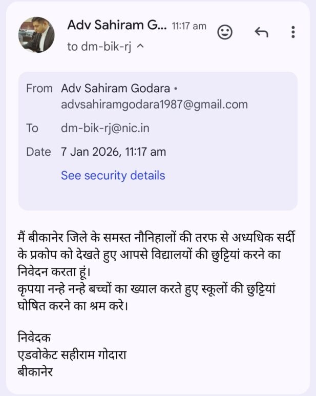वहीं जागरूक नागरिक और अधिवक्ता सहीराम गोदारा ने कलक्टर कार्यालय को मेल कर छुट्टी के लिए निवेदन किया है। जिसमें लिखा गया है कि सर्दी अत्यधिक है, ऐसे में छोटे बच्चों की छुट्टी की जावे। सहीराम गोदारा ने इस सम्बंध में जानकारी देते हुए बताया कि इस सम्बंध में उन्होने व्हाटसअप के जरिये भी कलक्टर को निवेदन किया है।