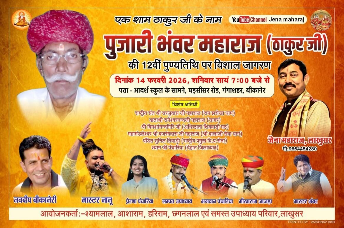 Bikaner News राजस्थान 1st न्यूज,बीकानेर। बीकानेर के घड़सीसर रोड़ गंगाशहर में आज एक शाम ठाकुर जी के नाम भजन संध्या का आयोजन होगा। शाम 7 बजे से यह आयोजन शुरू होगा जो कि देर रात तक चलेगा। इस सम्बंध में भाजपा नेता जैना महाराज ने बताया कि पुजारी भंवर महाराज ठाकुर जी की याद में बीते 12 वर्षो से यह आयोजन लाखुसर गांव में आयोजित किया जाता रह है लेकिन इस बाद यह आयोजन बीकानेर के गंगाशहर में आयोजित किया जाएगा। जैना महाराज ने बताया कि पुजारी भंवर जी महाराज की 12वीं पुण्यतिथि पर यह भजन संध्या होगी।