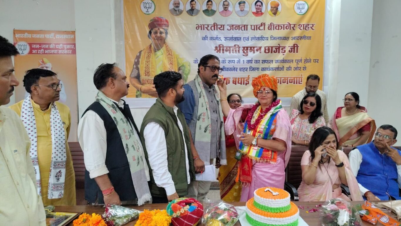 Bikaner News राजस्थान 1st न्यूज,बीकानेर। भारतीय जनता पार्टी के बीकानेर संभाग कार्यालय में बीकानेर शहर जिला अध्यक्ष सुमन छाजेड़ के एक वर्ष के सफलतम कार्यकाल के उपलक्ष में चंग पर धमाल कार्यक्रम का आयोजन किया गया। कार्यक्रम में उत्साहपूर्ण माहौल रहा तथा पदाधिकारियों और कार्यकर्ताओं ने जिलाध्यक्ष को बधाई एवं शुभकामनाएं दीं।