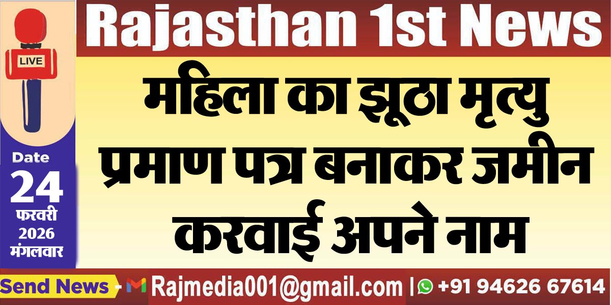 Bikaner News राजस्थान 1st न्यूज,बीकानेर। फर्जी मृ़त्यु प्रमाण पत्र बनाकर जमीन हड़पने का मामला सामने आया है। इस सम्बंध में जसरासर पुलिस थाने में थावरिया निवासी सत्यनारायण पुत्र घेवरराम ने भंवरलाल, श्यामलाल के खिलाफ मुकदमा दर्ज करवाया है। घटना थावरिया में 20 जनवरी की है। इस सम्बंध में प्रार्थी ने बताया कि आरोपियों ने उसकी चाची का फर्जी मृत्यु प्रमाण पत्र बनाने के लिए झूठा शपथ पत्र पेश किया और 17 हैक्टेयर जमीन अपने नाम पर करवा ली। पुलिस ने प्रार्थी की रिपोर्ट के आधार पर मुकदमा दर्ज कर जांच शुरू कर दी है।