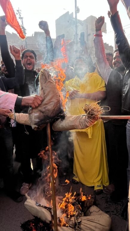 Bikaner News राजस्थान 1st न्यूज,बीकानेर। बांग्लादेश में हिंदू युवक दीपूचन्द्र दास की निर्ममता से हत्या के विरोध में देशभर में विरोध प्रदर्शन जारी है। लगातार हिंदू संगठन केन्द्र की मोदी सरकार से सख्त कार्रवाई की मांग कर रहे हैं। इसी कड़ी में आज बीकानेर में बजरंग दल और वीएचपी द्वारा विरोध प्रदर्शन करते हुए बांग्लादेश का पुतला जलाया गया। स्थानीय कोटगेट पर बजरंग दल के कार्यकर्ताओं द्वारा नारेबाजी करते हुए पुतला जलाया गया और सख्त कार्रवाई की मांग की गयी।