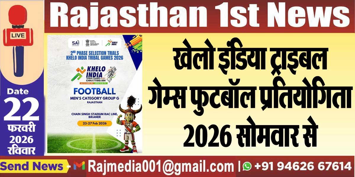 राजस्थान 1st न्यूज,बीकानेर। स्पोर्ट्स अथॉरिटी ऑफ इंडिया एवं खेल मंत्रालय, भारत सरकार के आदेशानुसार तथा अखिल भारतीय फुटबॉल महासंघ और राजस्थान फुटबॉल संघ के निर्देशन में बीकानेर फुटबॉल क्लब द्वारा स्थानीय चैन सिंह स्टेडियम फुटबॉल मैदान पर खेलो इंडिया ट्राइबल नेशनल गेम्स 2026 के अंतर्गत राष्ट्रीय स्तरीय फुटबॉल प्रतियोगिता का शुभारंभ सोमवार से होगा।