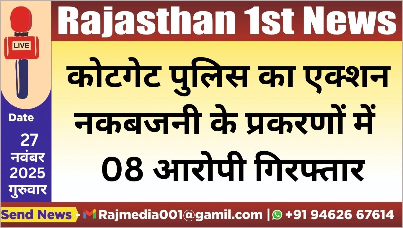 Bikaner News राजस्थान 1st न्यूज़,बीकानेर। कोटगेट पुलिस ने कारवाई करते हुए आठ आरोपियों को गिरफ्तार किया है। महानिरीक्षक बीकानेर रेंज हेमन्त शर्मा आईपीएस द्वारा चलाये गये विशेष अभियान “एरिया डॉमिनेशन” के तहत पुलिस अधीक्षक जिला बीकानेर कावेन्द्र सिंह सागर आईपीएस, अतिरिक्त पुलिस अधीक्षक शहर बीकानेर सौरभ तिवाड़ी आरपीएस के निर्देशन में, वृताधिकारी वृत नगर श्रवणदास संत आरपीएस के सुपरवीजन में थानाधिकारी कोटगेट धीरेन्द्र सिंह द्वारा यह कार्रवाई की गई।