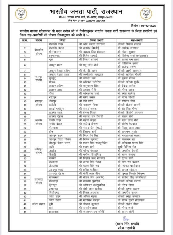 Bikaner News भाजपा ने प्रभारियों और सह प्रभारियों की घोषणा