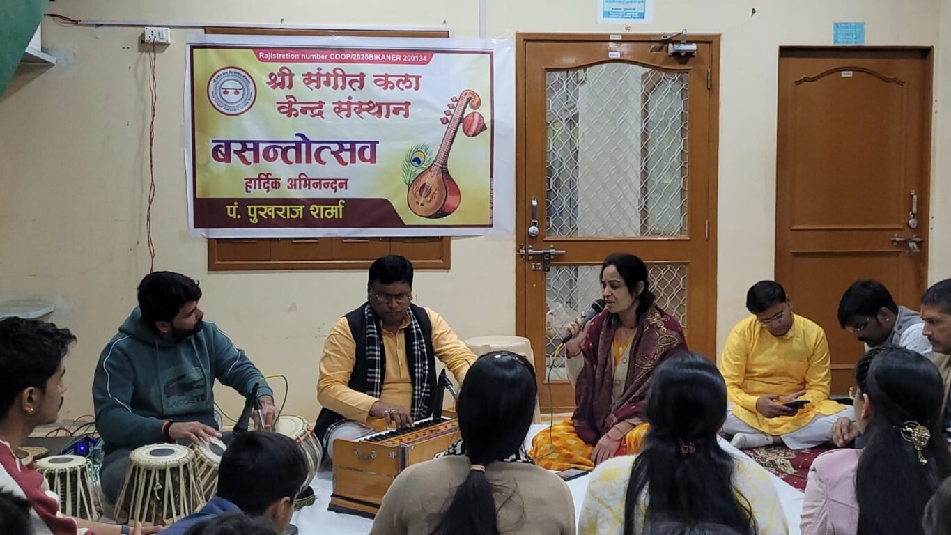 Bikaner News राजस्थान 1st न्यूज, बीकानेर। श्री संगीत कला केन्द्र संस्थान गंगाशहर में बसन्त पंचमी को वसन्तोत्सव मनाया गया। जिसमे कला केन्द्र के विद्यार्थी सुनिता स्वामी ने राग बसन्त्त में ख़्याल प्रस्तुत किया। भगवती (वामी, अमित तेजी, लड़ती स्वामी, आख देरडेकर, गोपिका सोनी, सीमा सिंह शेखावत, कृतिका व्यास, आनन्द पडिहार, मोहित मांडण, बजरंग शर्मा, तथा अन्य संस्थाओं के विधार्थीयों ने भी अपनी प्रस्तुति प्रदान की। केंद्र के अध्यक्ष डालचन्द सेवग ने माँ सरस्वती का पूजन कर अपने उद्बोधन में कहा कि स्वर की देवी माँ सरस्वती के जनमोत्सव पर संगीत का आयोजन कर उनकी सच्ची आराधना है
