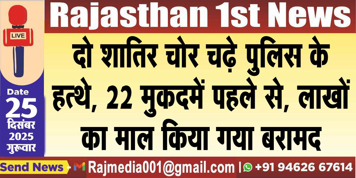 Bikaner News राजस्थान 1st न्यूज,बीकानेर। कोतवाली क्षेत्र में लाखों की चोरी के मामलें में पुलिस ने शातिर चोर को गिरफ्ता र किया है। जिस पर पहले से ही करीब दो दर्जन मुकदमें दर्ज है। इस सम्बंध में जुलाई में सुमित कोचर ने रिपोर्ट देते हुए बताया था कि उसके रिश्तेदार जो कि सूरत किसी काम से गए हुए थे। इसी दौरान पीछे से अज्ञात चोरों ने उसके घर में सेंधमारी कर लाखों के गहने चोरी कर लिए। पुलिस ने रिपोर्ट के आधार पर मुकदमा दर्ज कर ाजंच शुरू की। जांच के दौरान पुलिस टीम ने आसपास के सीसीटीवी खंगाले और कुछ संदिग्धों को चिन्हित किया। पुलिस ने रेंज आईजी हेमंत शर्मा एसपी कावेंद्र सिंह सागर के निर्देशन में थाना अधिकारी सविता डाल के नेतृत्व में जांच के दौरान सुरेश उर्फ सूर्या और मदन मोहन को गिरफ्तार किया गया।