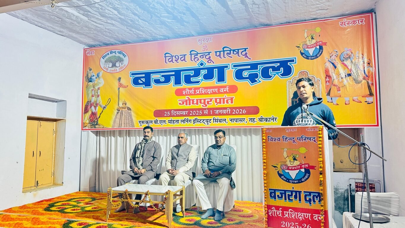 यूनान मिस्र रोमा मिट गए – कुछ बात है कि हस्ती मिटती नहीं हमारी। कार्यक्रम में वर्ग पालक भूपेश ,बी एल मेहता इंस्टीट्यूट के संचालक बाबूलाल, बजरंग दल प्रान्त संयोजक विक्रम परिहार, सह संयोजक दीपक प्रजापत, बौद्धिक प्रमुख खरताराम, सह बौद्धिक प्रमुख दिनेश परिहार ,प्रांत गौ रक्षा प्रमुख इंद्रजीत, प्रांत प्रशिक्षण प्रमुख सचिन, मुख्य शिक्षक उमेश ,प्रांत मिलन प्रमुख गजेंद्र ,विभाग मंत्री विनोद सेन जिला मंत्री राजेन्द्र सहित बजरंग दल के अनेक कार्यकर्ता उपस्थित थे।