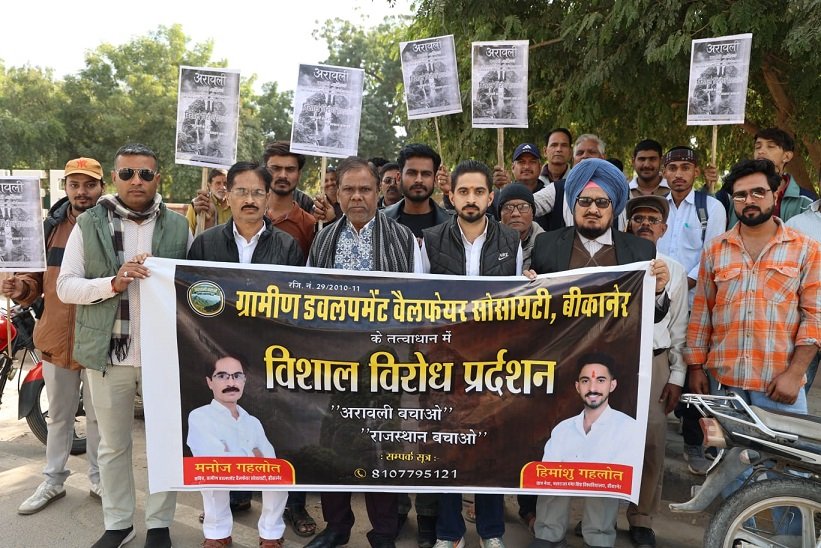 Bikaner News राजस्थान 1st न्यूज,बीकानेर। ग्रामीण डेवलपमेंट वेलफेयर सोसायटी, बीकानेर के तत्वाधान में आज शहीद स्मारक से पैदल चलकर अरावली काटने पर विरोध प्रदर्शन किया गया। अरावली बचाओं के नारे के साथ युवाओं ने प्रदर्शन किया और कहा कि 100 मीटर से कम ऊँचाई वाली पहाडिय़ों को संरक्षण की सूची से बाहर रखा जा सकता है तथा उन्हें काटा जा सकता है।