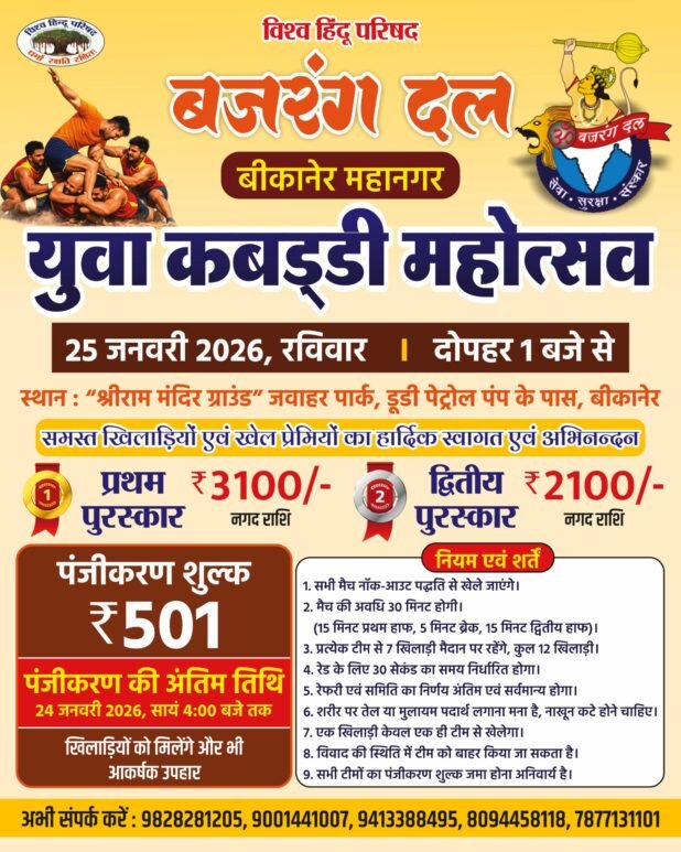 Bikaner News राजस्थान 1st न्यूज,बीकानेर। विश्व हिंदू परिषद बजरंग दल, बीकानेर महानगर की ओर से युवाओं में बढ़ती नशे की प्रवृत्ति के विरुद्ध जागरूकता एवं खेलों के प्रति रुचि बढ़ाने के उद्देश्य से युवा कबड्डी महोत्सव के अंतर्गत एकदिवसीय कबड्डी टूर्नामेंट का आयोजन किया जा रहा है। यह प्रतियोगिता 25 जनवरी 2026 को डूडी पेट्रोल पंप के पास स्थित जवाहर पार्क मैदान, बीकानेर में आयोजित होगी।