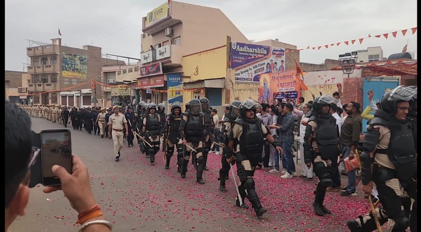 धर्मयात्रा की तैयारियों के तहत शहर में सुरक्षा व्यवस्था को लेकर पुलिस प्रशासन भी पूरी तरह सतर्क नजर आया। विभिन्न क्षेत्रों में पुलिस द्वारा फ्लैग मार्च निकाला गया, जिससे आमजन में सुरक्षा का विश्वास बढ़ा। इस दौरान कार्यक्रम संयोजक उमेश व्यास, समिति के महामंत्री नवीन एवं अन्य कार्यकर्ताओं द्वारा पुलिस दल पर पुष्पवर्षा कर उनका स्वागत किया गया और प्रशासन के सहयोग की सराहना की गई।