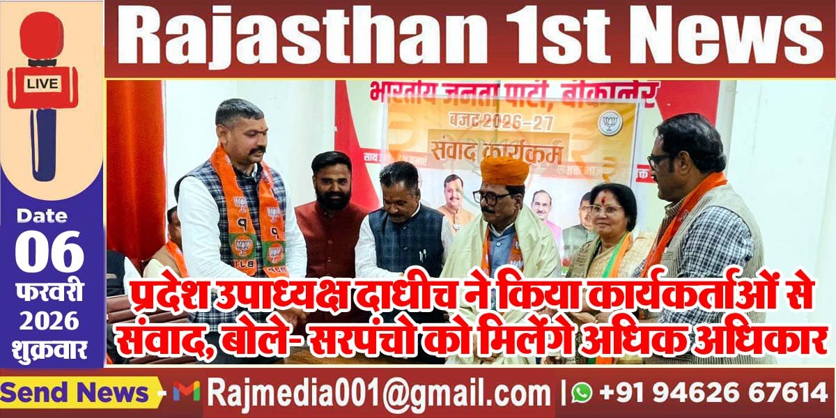Bikaner News राजस्थान 1st न्यूज,बीकानेर। आज बीकानेर संभाग कार्यालय में केंद्रीय बजट 2026-27 एवं वीबी जी राम जी विषय पर भाजपा राजस्थान प्रदेश उपाध्यक्ष मुकेश दाधीच ने संवाद किया। कार्यक्रम में बजट के प्रावधानों, ग्राम विकास और रोजगार सृजन को लेकर विस्तार से चर्चा की गई। इस अवसर पर बीकानेर देहात जिलाध्यक्ष श्याम पंचारिया, बीकानेर शहर जिलाध्यक्ष सुमन छाजेड़, प्रदेश प्रवक्ता भवानी पाईवाल, बजट अभियान जिला संयोजक रामेश्वर पारीक, देहात जिला महामंत्री दिलीप सिंह राजपुरोहित सहित बड़ी संख्या में पार्टी पदाधिकारी एवं कार्यकर्ता मौजूद रहे।