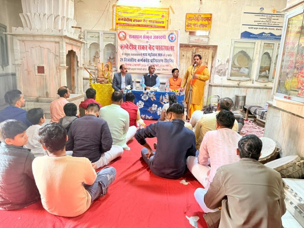Bikaner News राजस्थान 1st न्यूज,बीकानेर। वैदिक परंपरा, संस्कार शिक्षा एवं शुद्ध कर्मकांड पद्धति के प्रसार हेतु राजस्थान संस्कृत अकादमी के तत्वावधान में तथा ऋग्वेदीय राका वेद पाठशाला के संयुक्त सहयोग से आयोजित 21 दिवसीय नि:शुल्क कर्मकांड प्रशिक्षण शिविर का आज गोगा गेट बाहर स्थित ऋग्वेदी ब्राह्मण गायत्री मंदिर परिसर में वैदिक मंत्रोच्चार एवं मंगलाचार के साथ विधिवत् शुभारम्भ हुआ। यह शिविर माघ महोत्सव 2026 के अंतर्गत आयोजित किया जा रहा है। कार्यक्रम का शुभारम्भ छात्रा अंशु शर्मा एवं हुनर शर्मा द्वारा गणेश वंदना से किया गया, जिससे वातावरण आध्यात्मिक ऊर्जा से ओतप्रोत हो उठा।