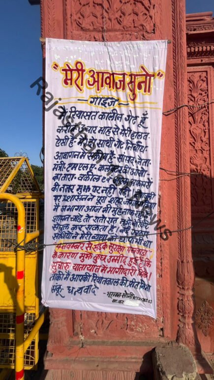 जिसमें लिखा गया है कि में रियासत कालीन गेट हूंू, लंबे समय से मेरी हालत ऐसी है मेरे दो साथी गेट निर्बाध रूप से आवागमन में सक्रीय है-सांसद,नेता,मंत्री,एमएलए,कलक्टर की आंखो का तारा-वकील-अधिकारियों की नजर मुझ पर नहीं पड़ी। दीपावली पर प्रशासन ने पूरा शहर जगमग कर दिया लेकिन में अभागा मुंह ताक रहा हूं।