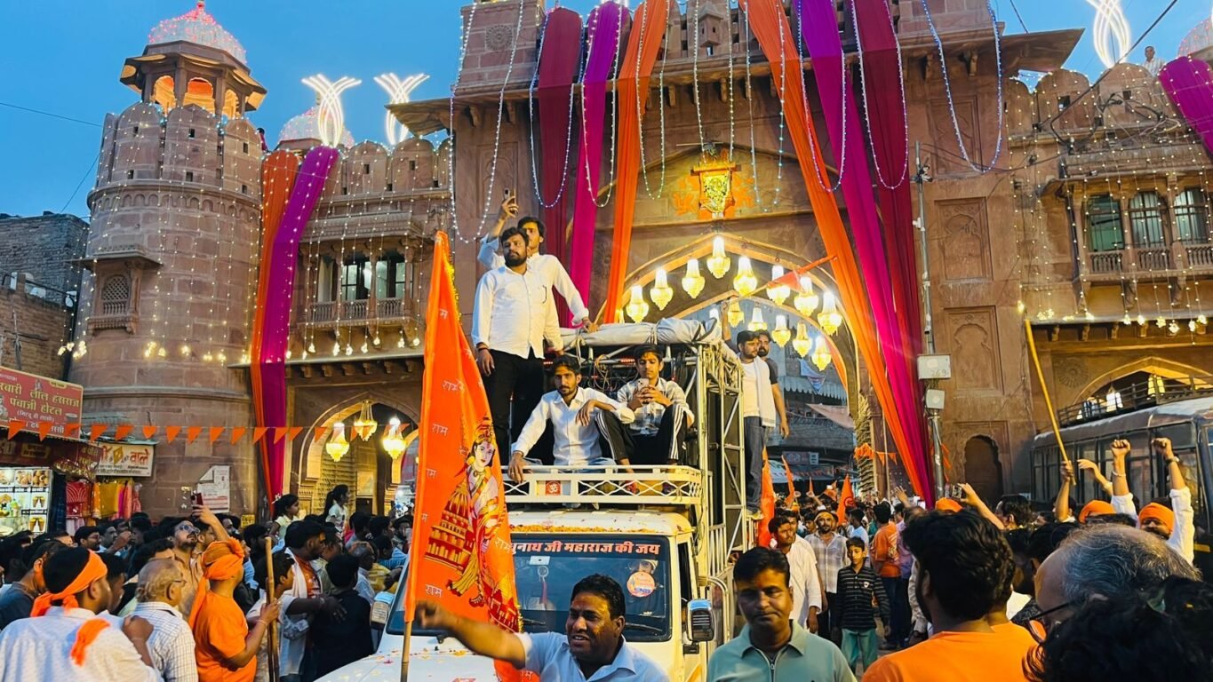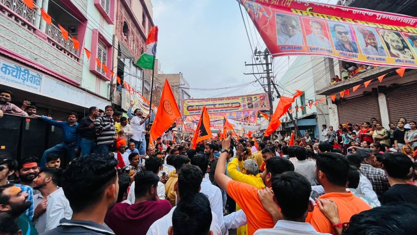 Dharmyatra News  राजस्थान 1st न्यूज,बीकानेर। भारतीय नवसंवत्सर 2083 पर हर वर्ष की भांति इस वर्ष भी भव्य धर्मयात्रा का आयोजन हुआ। दोपहर करीब चार बजे धर्मयात्रा एमएम ग्राउण्ड से रवाना हुई। धर्मयात्रा के रवाना होने पूर्व ही धर्मयात्रा के मार्ग, छतों पर हजारों हजार की संख्या में लोग खड़े धर्मयात्रियों का इंतजार करते हुए दिखाई दिए। बड़ी संख्या में युवतियां,महिलाएं भी इस दौरान मौजूद रहीं। रेगितस्तान के जहाज ऊंट धर्मयात्रा में सबसे आगे चल रहे थे। जिसमें भगवा ध्वज और रंग बिरंगे कपड़ों में युवा बैठे जय श्री राम का उद्घोष करत हुए नजर आए।