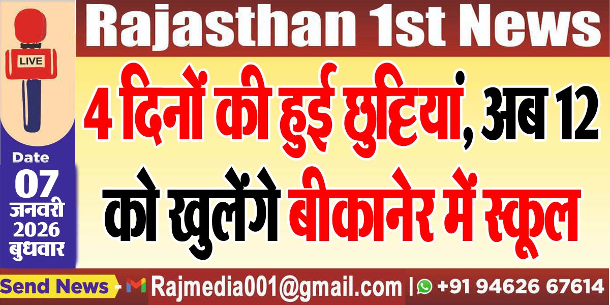 Bikaner News राजस्थान 1st न्यूज,बीकानेर। जिले में लगातार बनी शीतलहर की स्थिति को देखते हुए जिला प्रशासन ने विद्यार्थियों के स्वास्थ्य एवं सुरक्षा के मद्देनजऱ रखते हुए बड़ा फैसला लिया है। जिला कलेक्टर नम्रता वृष्णि ने आपदा प्रबंधन अधिनियम 2005 के तहत प्रदत्त शक्तियों का उपयोग करते हुए बीकानेर जिले के समस्त राजकीय एवं गैर-राजकीय विद्यालयों में अध्ययनरत कक्षा 8 तक के विद्यार्थियों के लिए 8 जनवरी से 10 जनवरी तक शैक्षणिक अवकाश घोषित किया है।
