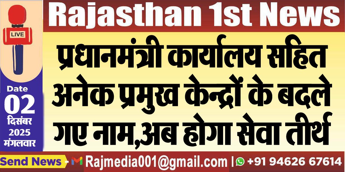 National News राजस्थान 1st न्यूज,नेटवर्क। प्रधानमंत्री कार्यालय सहित अनेक प्रमुख केन्द्रों के नाम बदल दिए गए है। केंद्र सरकार ने प्रधानमंत्री कार्यालय का नाम बदलकर सेवा तीर्थ कर दिया है। देश भर के राज्य भवन का नाम अब लोक भवन होगा। इसके अलावा केंद्रीय सचिवालय को कर्तव्य भवन के नाम से जाना जाएगा।