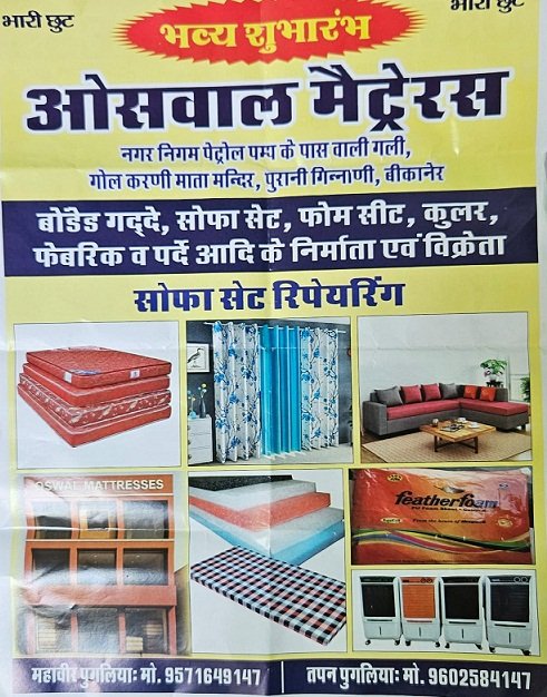राजस्थान 1st न्यूज,बीकानेर। प्रधानमंत्री नरेन्द्र मोदी के लोकल फॉर वोकल की नीति को फलीभूत करते हुए ओसवाल मैट्रेरस भी अपने ग्राहकों को कंपनी के उत्पाद रियायती कीमतों पर विक्रय कर रहा है। जिससे अब आम आदमी भी अपने सपनों के घर को सवार सकेगा। नगर निगम के पास स्थित पेट्रोल पंप के पास वाली गली में खुल रहे नये प्रतिष्ठान में ग्राहकों को ब्रांडेड कंपनी व स्वयं के निर्मित गद्दे,सोफा सेट,फोम सीट,कूलर,फेबरिक व पर्दे रियायती कीमतों पर दिए जा रहे है। दुकान संचालक महावीर पुगलिया ने बताया कि पिछले 60 वर्षों से पुस्तैनी इस फर्म का यह तीसरा प्रतिष्ठान है।