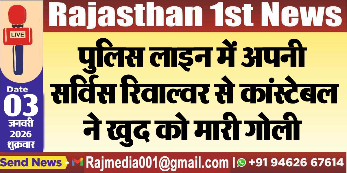 Rajasthan News राजस्थान 1st न्यूज,नेटवर्क। पुलिस लाइन में कांस्टेबल द्वारा अपनी सर्विस रिवॉल्वर द्वारा सुसाइड करने की खबर सामने आयी है। घटना प्रदेश के जेसलमेर से जुड़ी है। जहां पर पुलिस लाइन में एक कांस्टेबल ने अपनी सर्विस रिवॉल्वर से खुद को गोली मारकर खुदकुशी कर ली।