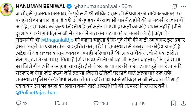 राजस्थान 1st न्यूज,नेटवर्क। पूर्व मंत्री गोविंद मेघवाल की गाड़ी पर हमले के प्रयास के मामले में अब हनुमान बेनीवाल ने भी प्रदेश सरकार की कानून व्यवस्था को लेकर सवाल उठा दिए है। बेनीवाल ने एक्स पर पोस्ट किया है। जिसमेंं बेनीवाल ने लिखा है कि एक पूर्व मंत्री की गाड़ी को रूकवाकर ड्राइवर के साथ मारपीट करने की सूचना मिली है जो कि निंदनीय है। बेनीवाल ने लिखा कि पूर्व मंत्री की गाड़ी रूकवाकर इस तरह का कृत्य करने से साफ है कि प्रदेश में कानून व्यवस्था कोई भय नहीं है। बेनीवाल ने प्रदेश के सीएम से मांग की है कि जल्द से जल्द हमला करने वालों की गिरफ्तारी होनी चाहिए। बता दे कि जालोर में देर शाम को पूर्व मंंत्री गोङ्क्षवद मेघवाल की गाड़ी को रूकवाकर उनके ड्राइवर के साथ हाथापाई की और गोविंद मेघवाल के साइड वाले कांच पर भी मुक्का मारा था।