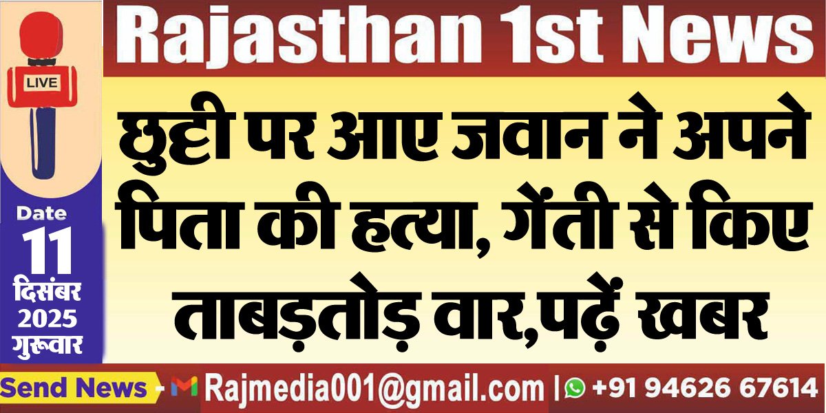 Rajasthan News राजस्थान 1st न्यूज,नेटवर्क। छुट्टी पर आए जवान द्वारा अपने पिता की बेरहमी से हत्या कर देने की खबर सामने आयी है। घटना जोधपुर के पीपाड़ सिटी के निकट साथीन गांव की है। जहां पर एक सीआईएसएफ जवान ने अपने ही पिता की बेरहमी से हत्या कर दी।