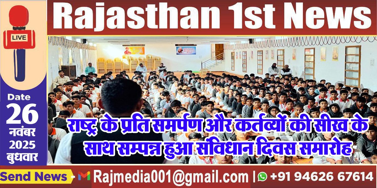 प्रधानाचार्य आशीष डागा ने कहा कि संविधान दिवस केवल औपचारिकता का अवसर नहीं, बल्कि आत्ममंथन का क्षण है। यह दिन हमें यह स्मरण कराता है कि कर्तव्यों की अनुपालना ही राष्ट्र को प्रगति-पथ पर आगे बढ़ाती है। उन्होंने विद्यार्थियों से देश के प्रति समर्पित, अनुशासित, पर्यावरण-हितैषी और सामाजिक सौहार्द के संवाहक बनने का आग्रह किया।