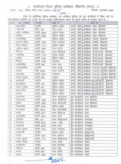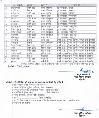 राजस्थान 1st न्यूज,बीकानेर। बीकानेर पुलिस अधीक्षक ने पुलिसकर्मियों के तबादलें किए है। एसपी मृदुल कच्छावा ने आदेश जारी करते हुए जिले के अतिरिक्त पुलिस अधीक्षक, उप अधीक्षक, वृत कार्यालय में रिक्त पदों पर पुलिसकर्मियों को लगाया गया है। एसपी ने 62 पुलिसकर्मियों को इधर से उधर किया है । जिनमें एएसआई, हैड कांस्टेबल, कांस्टेबलों के तबादलें किए गए है। आदेशों के अनुसार 13 एएसआई, 8 हैड कांस्टेबल और 41 कांस्टेबल को इधर से उधर किया है।